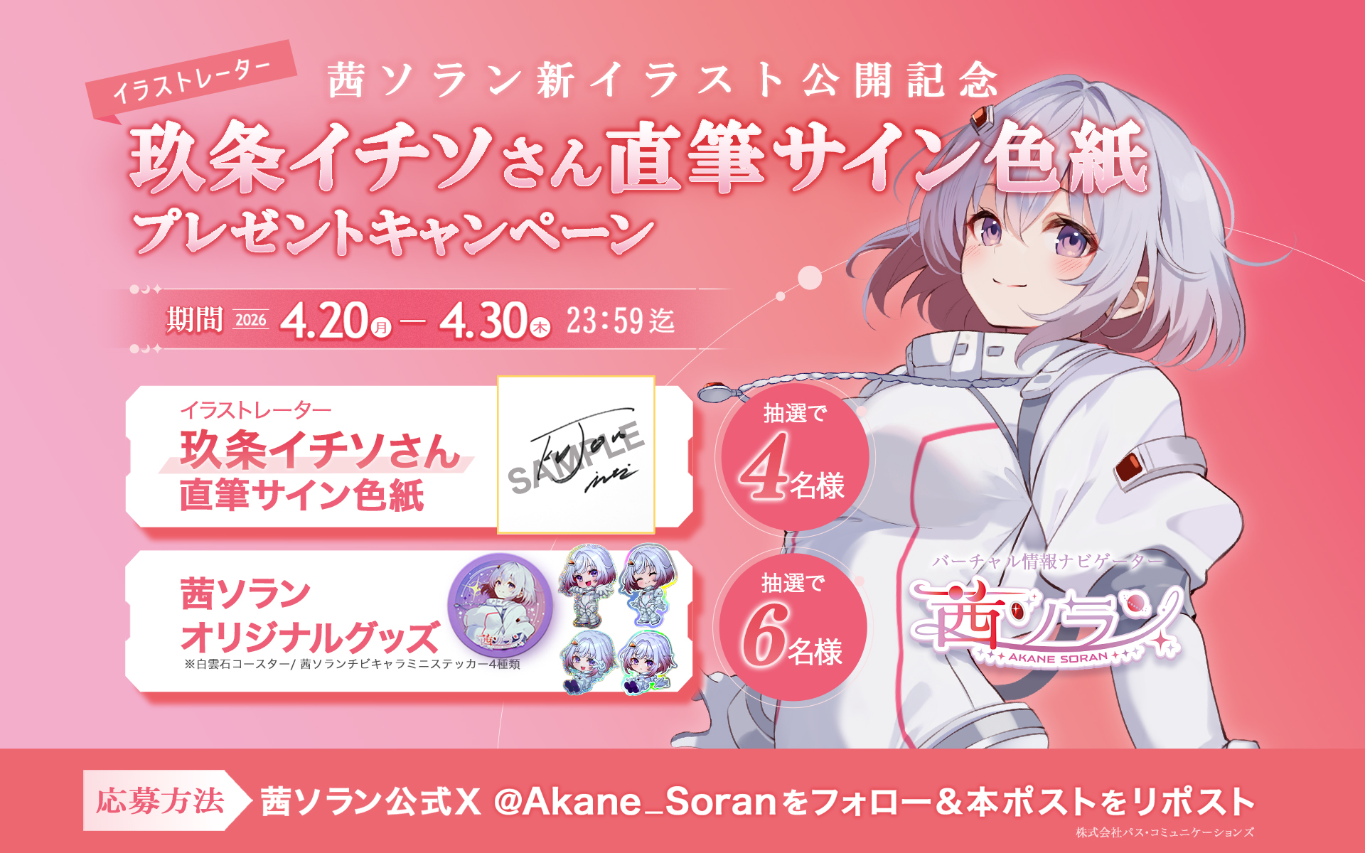 茜ソラン新イラスト公開を記念して、抽選で計10名様にイラストレーター玖条イチソさんの直筆サイン色紙などが当たるキャンペーンをXにて開催いたします。